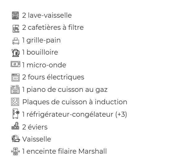 La Maison est LE cœur du domaine ! On se retrouve dans la grande Salle de vie, aménagée en 3 zones : une grande cuisine ouverte et équipée, de grandes tablées pour des repas conviviaux, et un espace salon avec cheminée pour des moments de douceur !