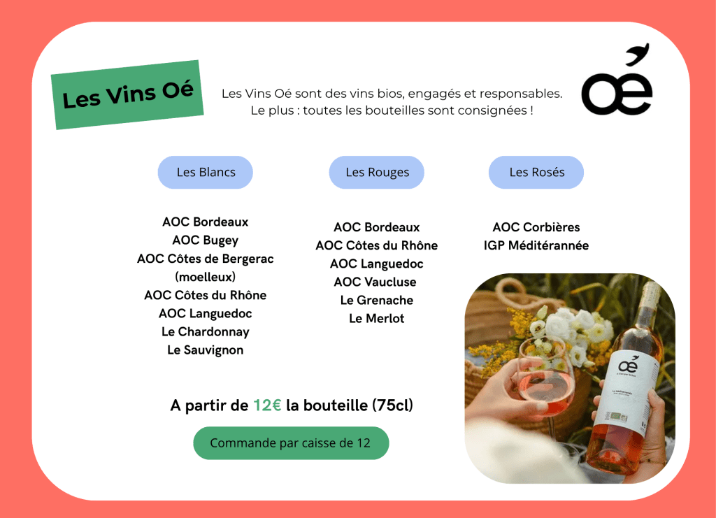 Parce qu’un bon repas mérite un bon vin, nous vous proposons une sélection de vins Oé, biologiques, consignés et livrés sur place avant votre séjour. Un engagement pour le goût et la planète, à déboucher sans attendre !