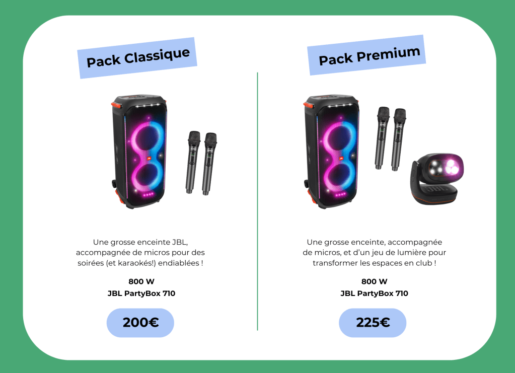 Envie de transformer votre séjour en véritable évènement ? Avec nos packs d’enceintes et lumières, créez l’ambiance qui vous ressemble : soirée dansante, karaoké endiablé ou discours mémorables !