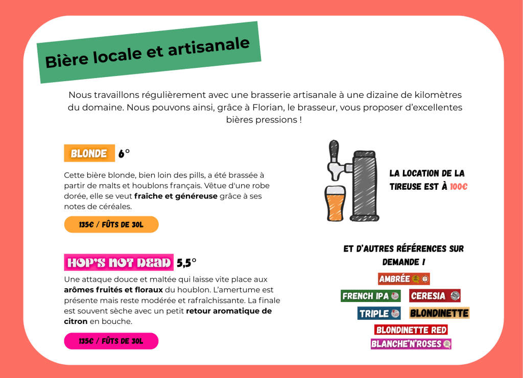 Rien de tel qu’une bonne bière pression pour accompagner vos moments de partage ! Nous collaborons avec Florian, un brasseur local passionné, installé à quelques kilomètres de Verdonne, pour vous proposer des bières artisanales de caractère. Blonde, Ambrée, ou spéciale, choisissez votre fût et profitez d’une tireuse déjà installée à votre arrivée.
